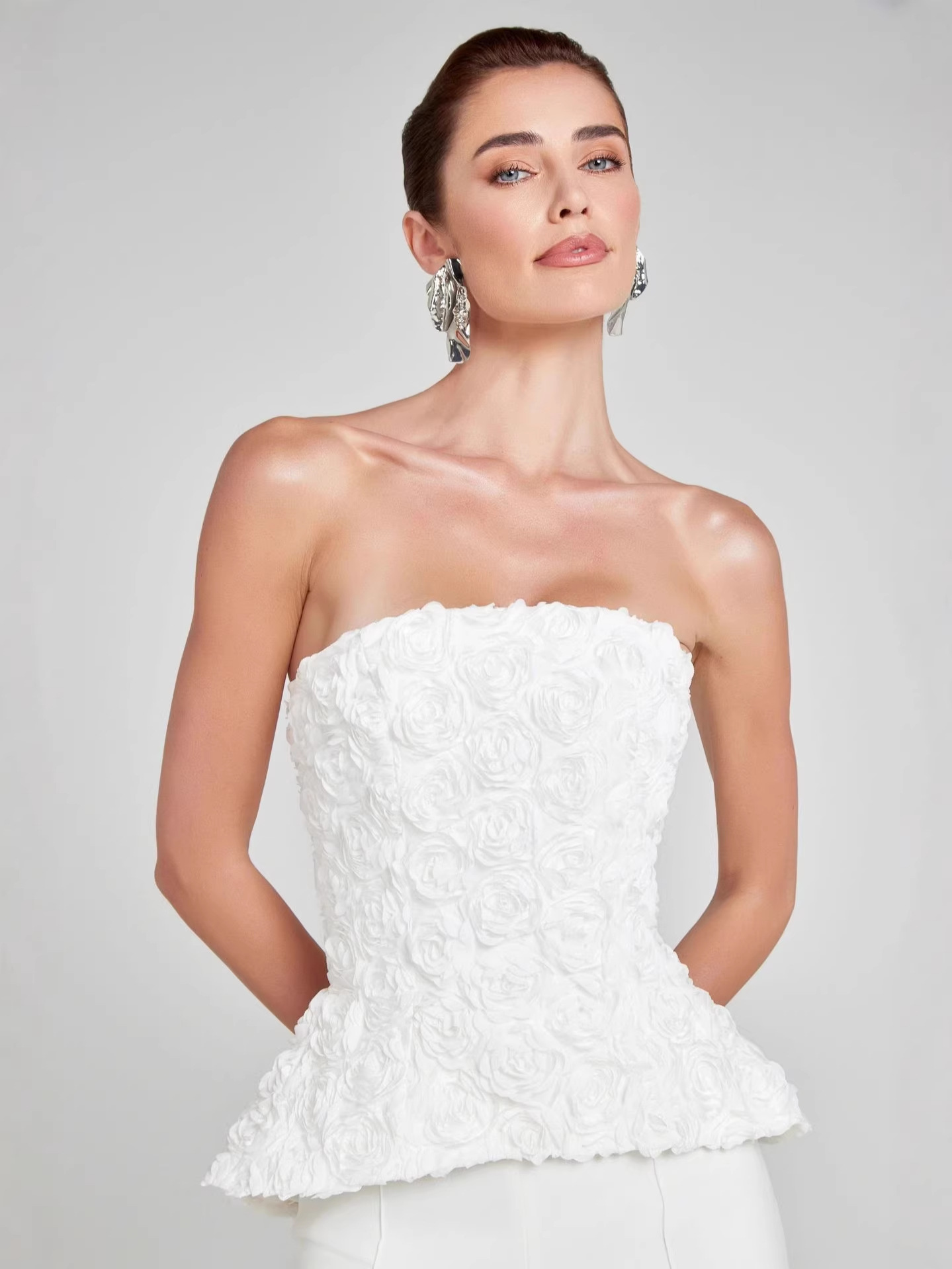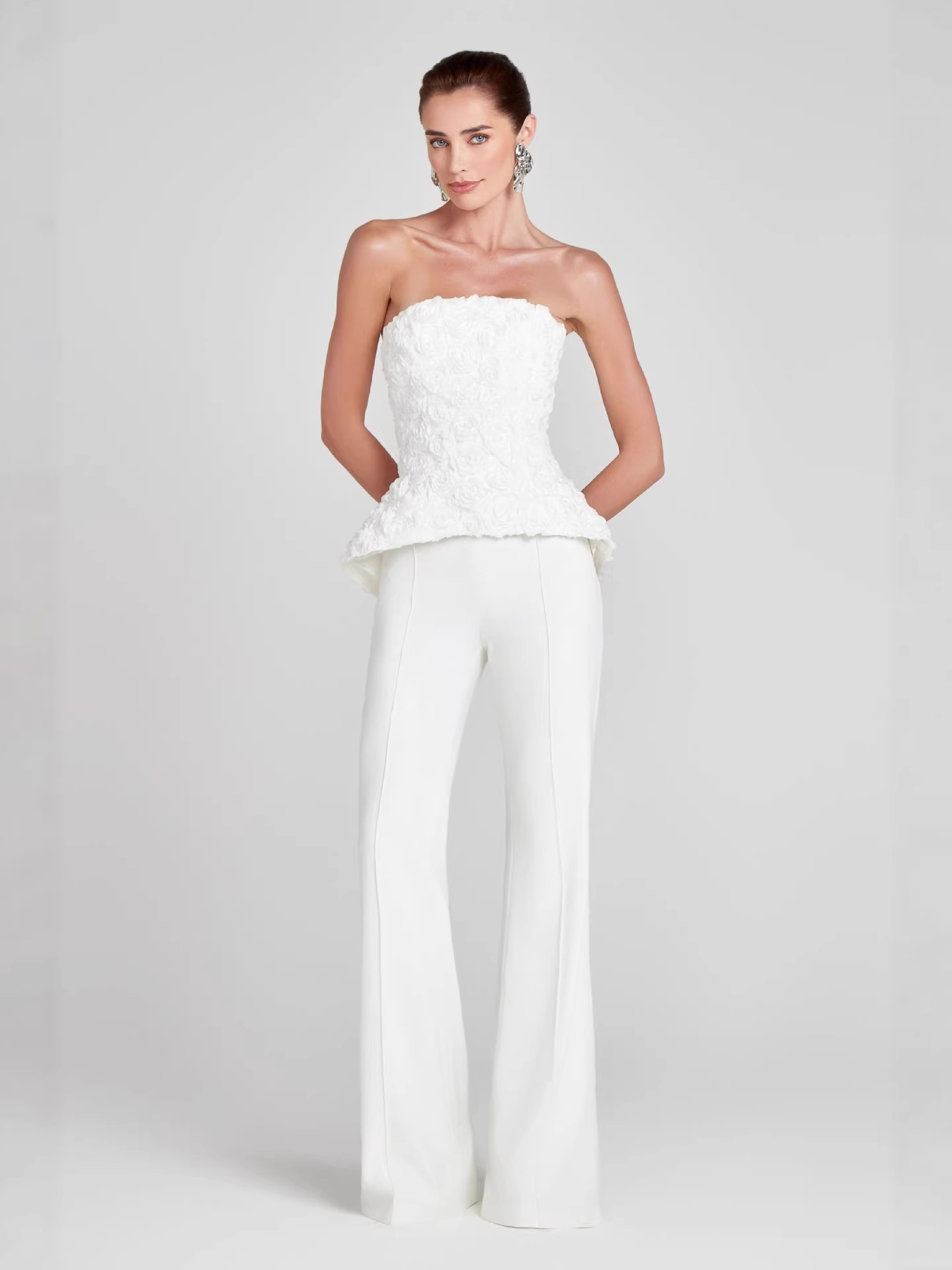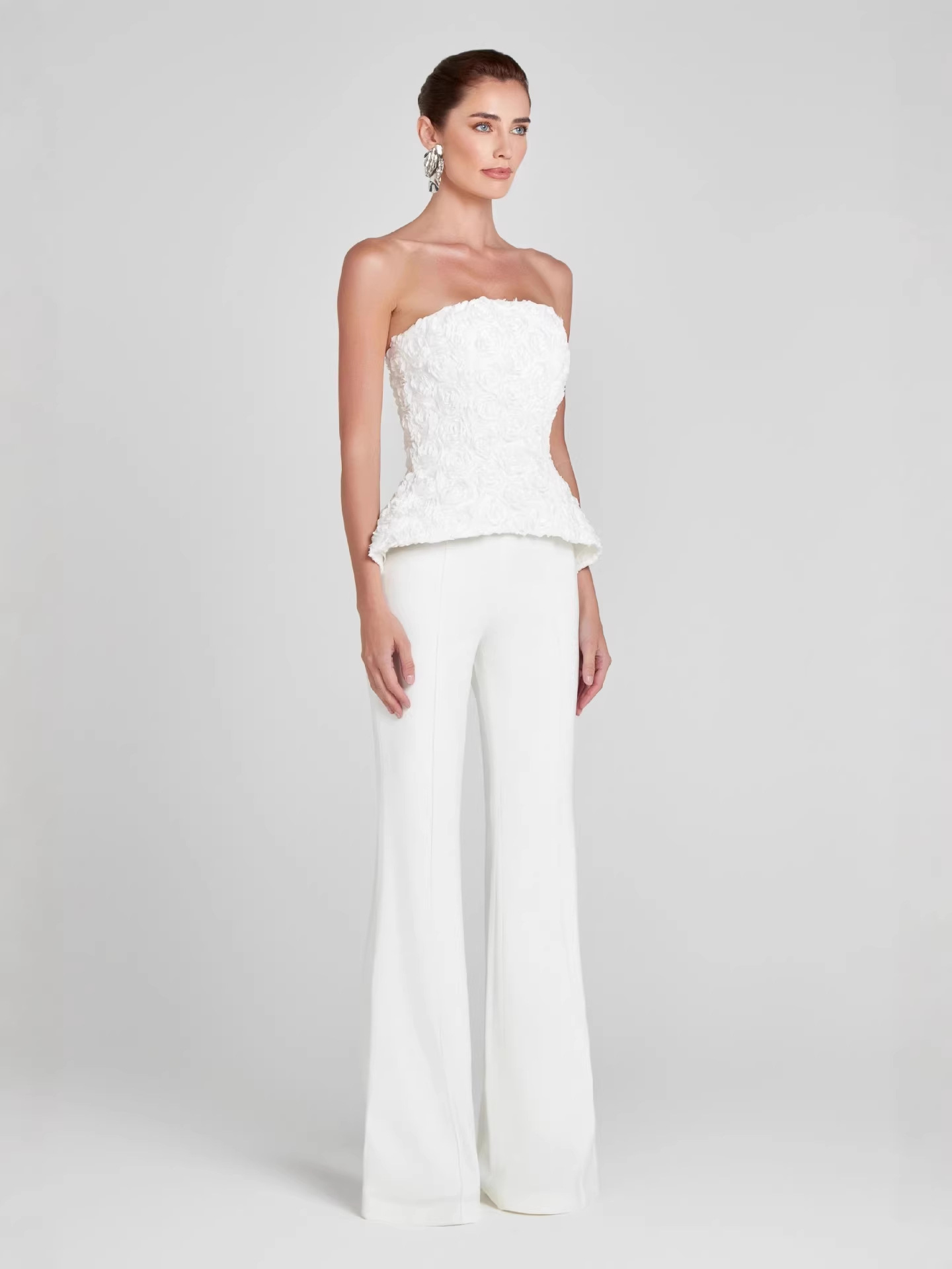 This elegant set features a structured strapless top with a sculpted silhouette that enhances your natural curves, paired with high-waisted tailored pants for a sleek, elongated look. The subtle 3D floral detailing adds texture and dimension, creating a statement piece that feels both modern and timeless.