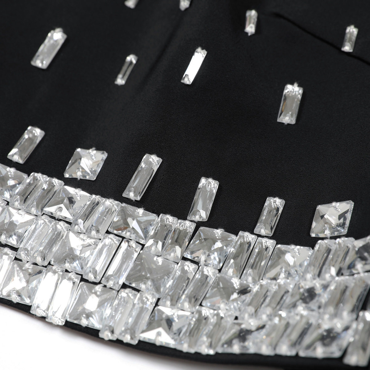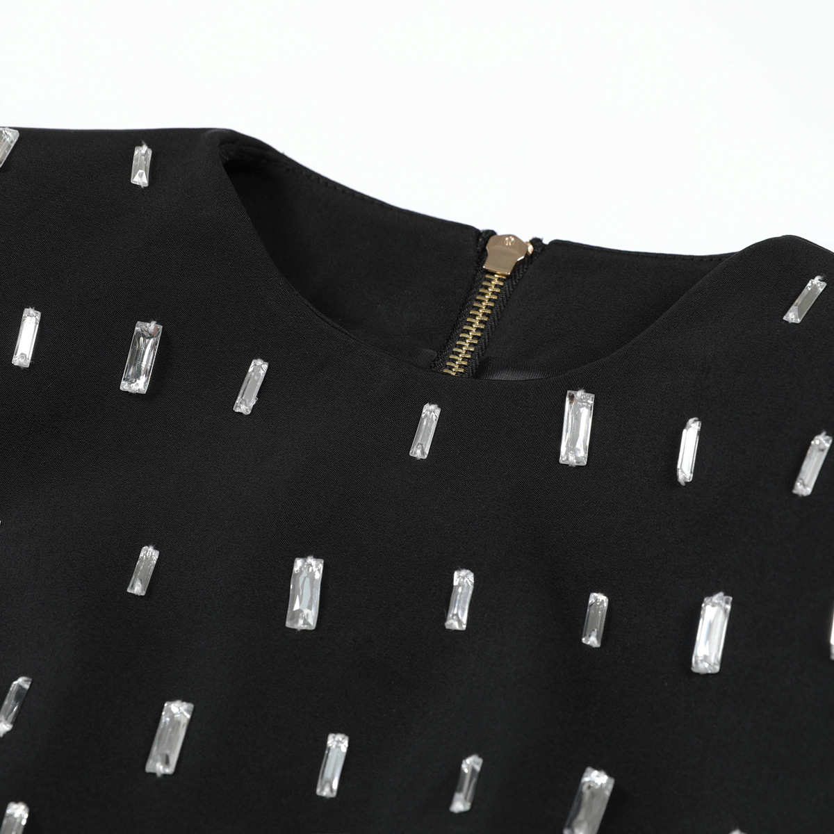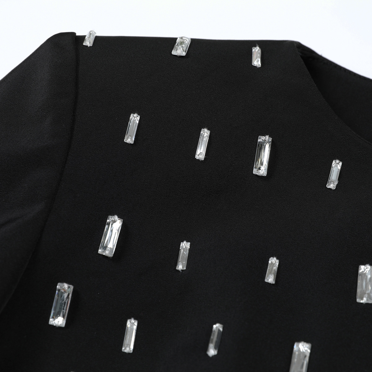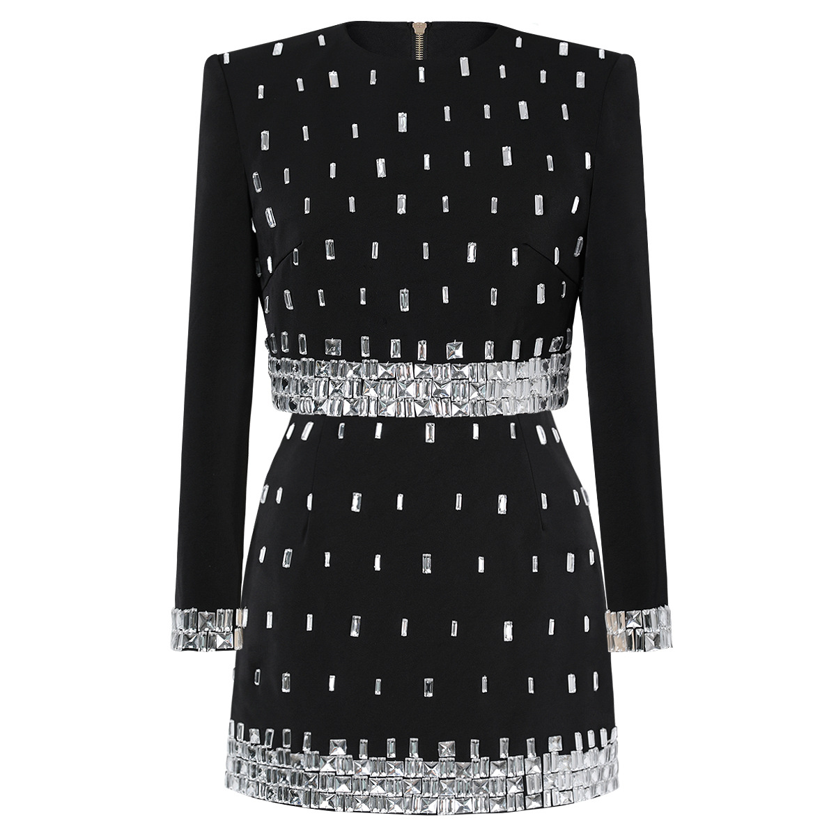 - Two-piece set (long-sleeve studded top + hip-hugging mini skirt)
